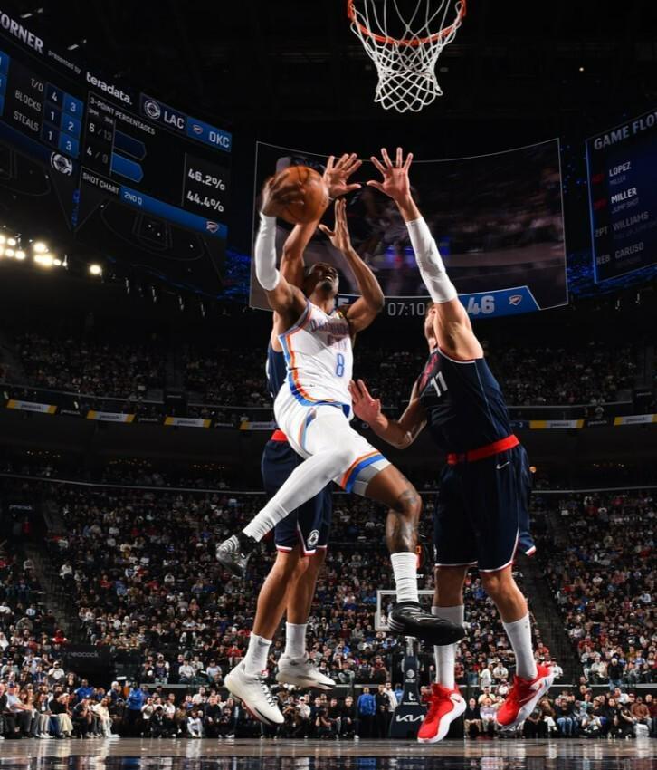 第二节巴图姆和米勒两位替补球员先后外线三分投进,快船35-44将分差追回到个位数。杰伦-威廉姆斯和霍姆格伦连拿9分,雷霆53-35迅速将分差拉开到18分。此后雷霆再接再厉,一波连拿12分过后,一度67-42领先达到25分。半场比赛结束时,雷霆69-49领先。